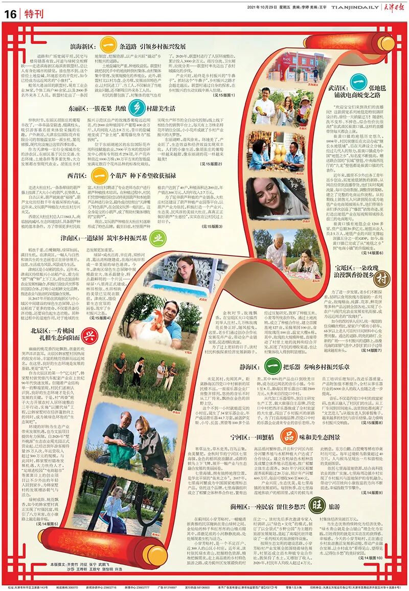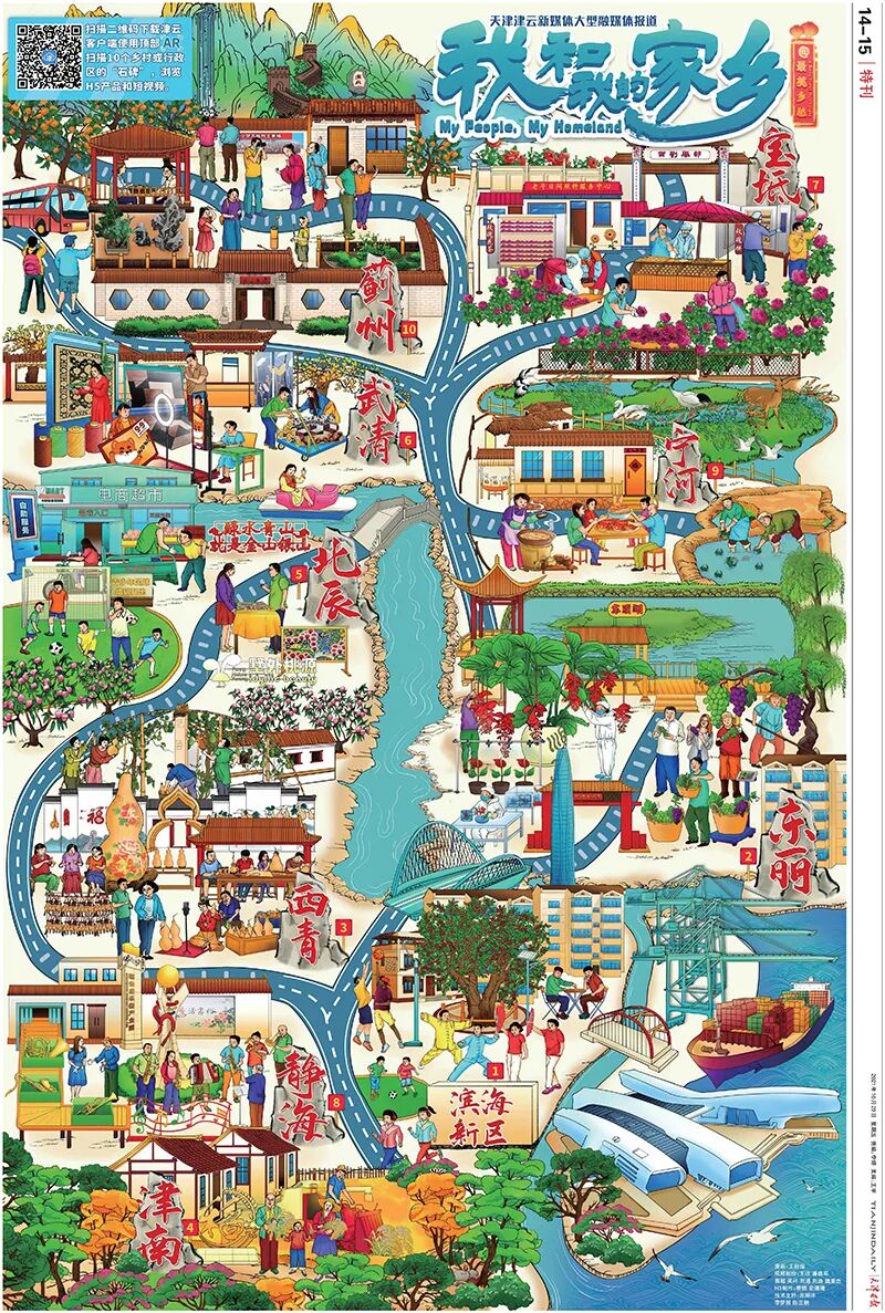 10月29日刊登在《天津日报》上的手绘画卷特色鲜明,整体洋溢着浓郁的杨柳青年画风格。10个涉农区依据在天津市地图上的分布依次排列,通衢的大道和蜿蜒的河流贯穿其中,从左上角至右下角,体现了“九河下稍天津卫”的特点,寓意着乡村振兴引领小康之路越走越宽广。设计团队从10个涉农区中挑选了特色乡村的特色场景,将其拼接成一幅画卷,使其成为天津乡村振兴的代表。画面既真实直观,又生动形象,兼顾新闻性的同时,也充满了艺术性。高饱和度配色既呼应了年画风格的创作理念,也突显了村民生活的温暖充实。