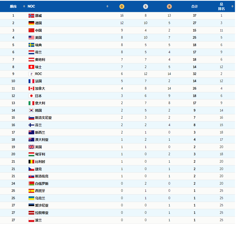2月20日,北京冬奥会所有比赛全部结束。中国体育代表团在单板滑雪、速度滑冰、短道速滑、钢架雪车、花样滑冰、自由式滑雪6个项目上,获得9金4银2铜共15枚奖牌。
