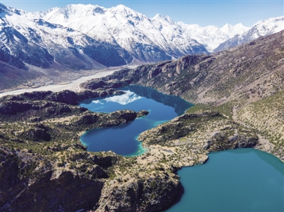 “三色湖”位于西藏昌都市边坝县边坝镇普玉村境内,由黑湖、白湖、黄湖组成,在阳光下颜色各异。湖水系山谷洼地多年积水而成。图为黑湖映射出雪山的倒影(无人机照片)。 ■新华社记者 周荻潇/摄