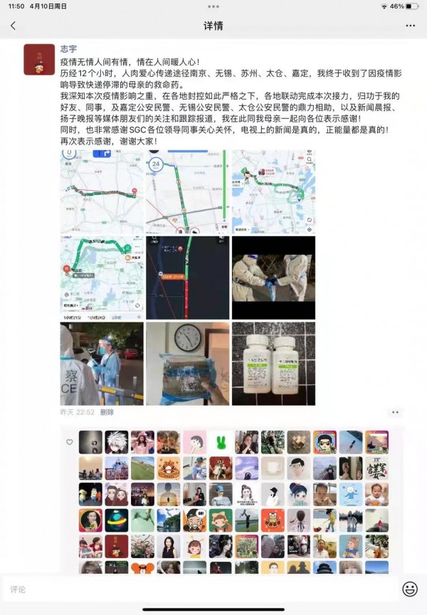 4月9日7时10分,陈先生发了一条朋友圈求助:“各位亲朋好友,我现在急需南京的朋友人肉接力帮我妈紧急送个药”“此药巨贵且难买,如果大家谁有办法完成接力,或部分路段的接力,请速与我联系,非常感谢”。陈先生的求助引起大家的广泛关注,朋友圈内纷纷响应、并出谋划策。