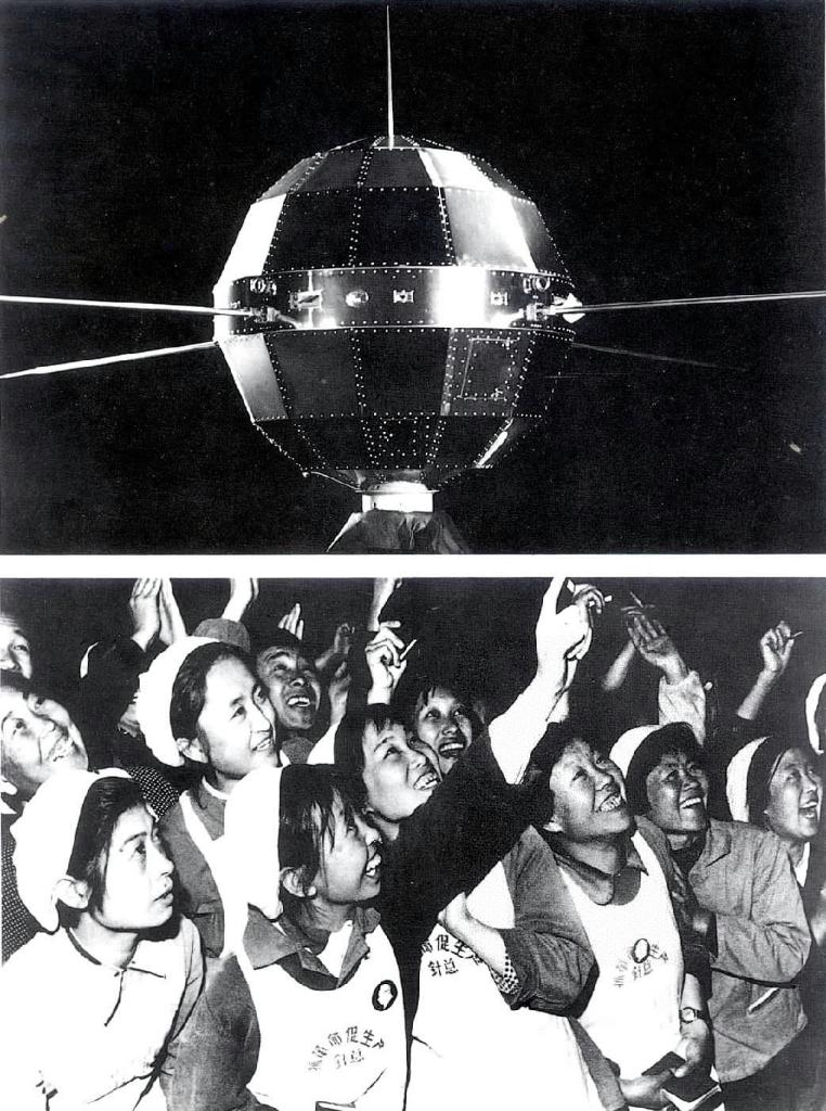 拼版照片:上图为我国第一颗人造地球卫星“东方红一号”;下图,人们争相眺望“东方红一号”通过北京上空(资料照片)。新华社发