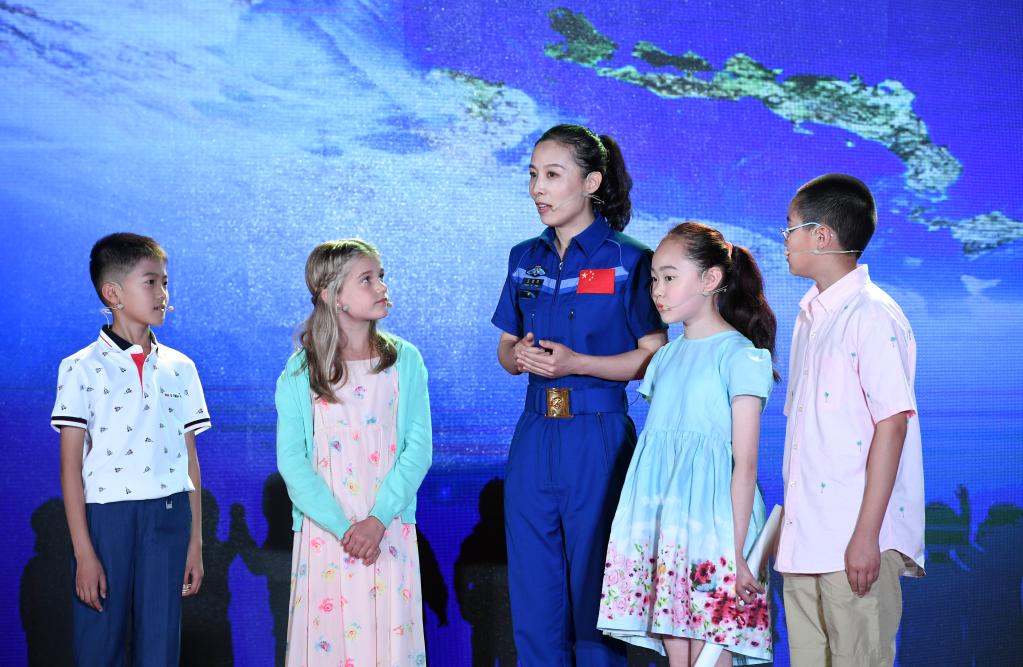 2017年6月6日,2017年“全球航天探索大会”在北京开幕,中国航天员王亚平(中)和中外少年进行畅想未来互动活动。新华社记者张领 摄