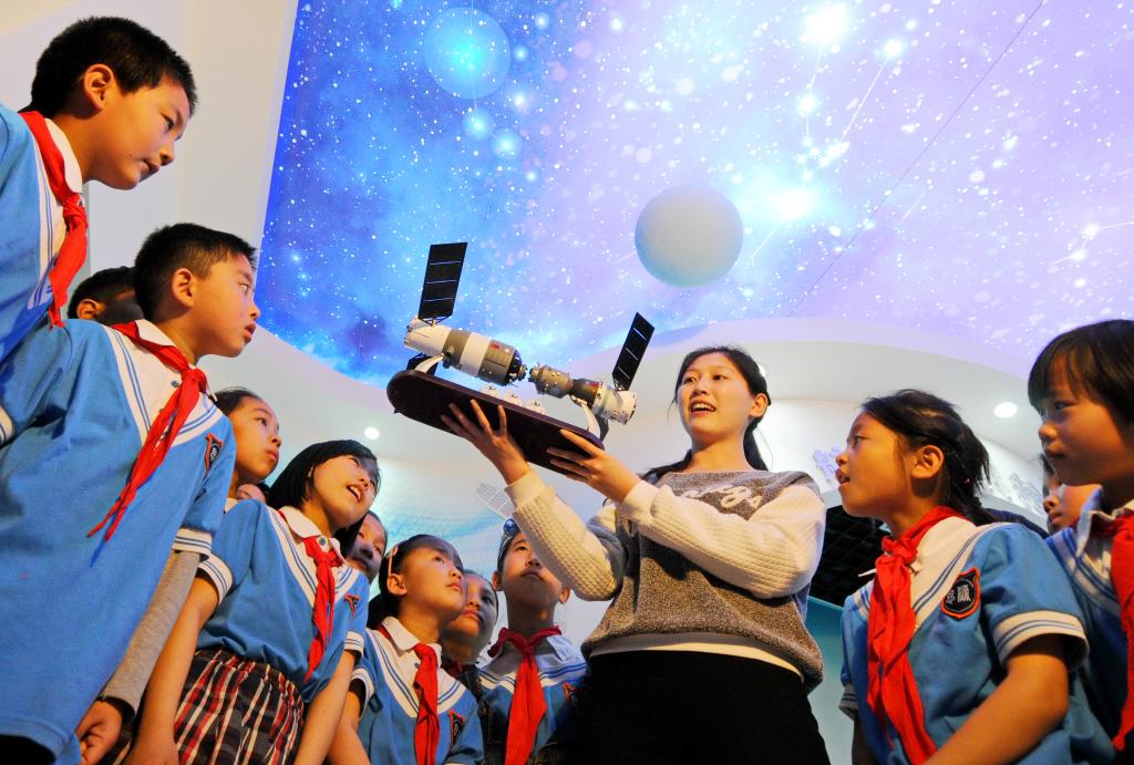 2016年4月24日是首个“中国航天日”,在河北邢台经济开发区思源实验学校的“航天梦 中国梦”主题科普系列活动上,老师为学生讲解航天知识。新华社记者朱旭东 摄