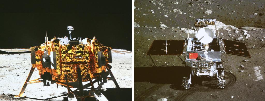 2013年12月15日,正在月球上开展科学探测工作的嫦娥三号着陆器和巡视器进行互成像实验,“两器”顺利互拍,嫦娥三号任务取得圆满成功。这是北京飞控中心大屏幕上显示的嫦娥三号着陆器、巡视器互拍成像(拼版照片,2013年12月15日摄)。新华社记者丁林摄