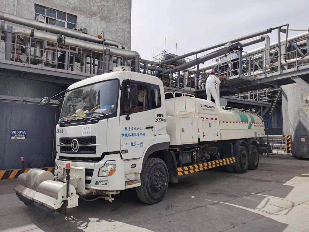 在青海宜化化工有限责任公司,工作人员正在用洒水车灌装次氯酸钠消毒液。(受访者供图)