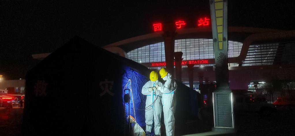 国网青海电力公司工作人员正为设在西宁火车站的核酸检测点接入临时电源。(受访者供图)