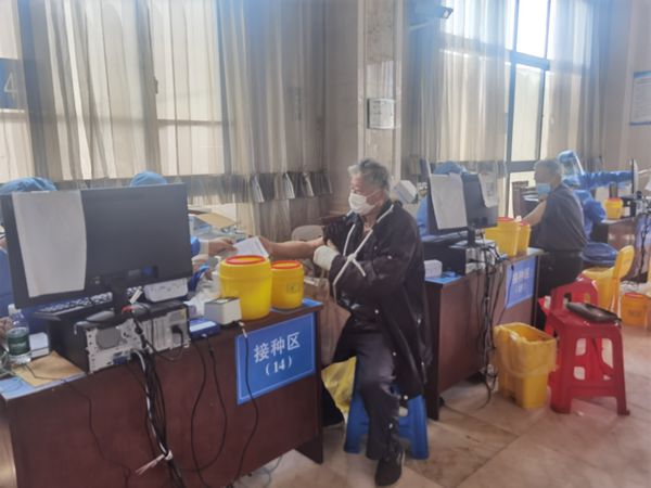 今年73岁的黄圣益老伯上午8时50分通过身份证和出门证离开了小区,乘坐居委会转运专车来到这里接种疫苗。在现场,市民们间隔一米排队依次接种。黄老伯说,今天他是第二次接种,因为身体不好患有多种疾病,以前一直对接种新冠疫苗有些犹豫。而这次疫情发生后,他也去咨询了自己的情况是否适合接种,在得到肯定的答复后决定参加接种疫苗。