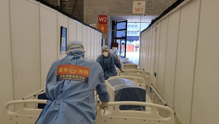 志愿者在上海新国际博览中心方舱医院里忙碌