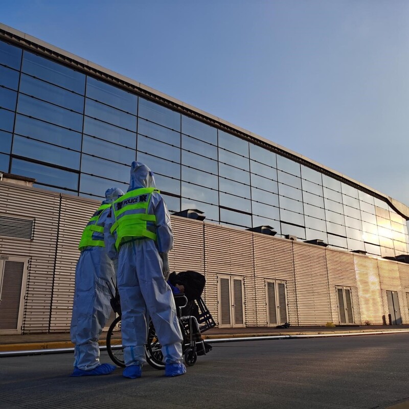 5月5日,N4舱收到新国博方舱医院仁济医院工作组指令,将N4还未出院的少量患者转移至N3舱。民警经过排摸发现,有一位行动不便的老年患者,谢悦安排他最后转移。“由于这位爷爷行动不便,进入方舱后很久没有到户外来了,爷爷在路上看到夕阳西下的美景,想停留一会儿。我们就陪他一起看了一会儿日落,那时正好有志愿者给我们拍下了一张照片。很美吧?”谢悦笑着说。