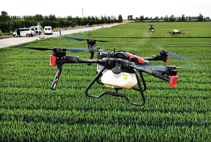 2022年5月17日,青岛平度田庄镇幸福庄村,植保无人机在进行“一喷三防”田间作业 李紫恒摄/本刊