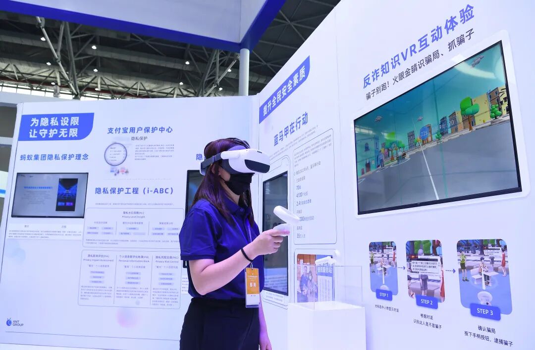 蚂蚁集团展台工作人员演示反诈知识VR互动体验。