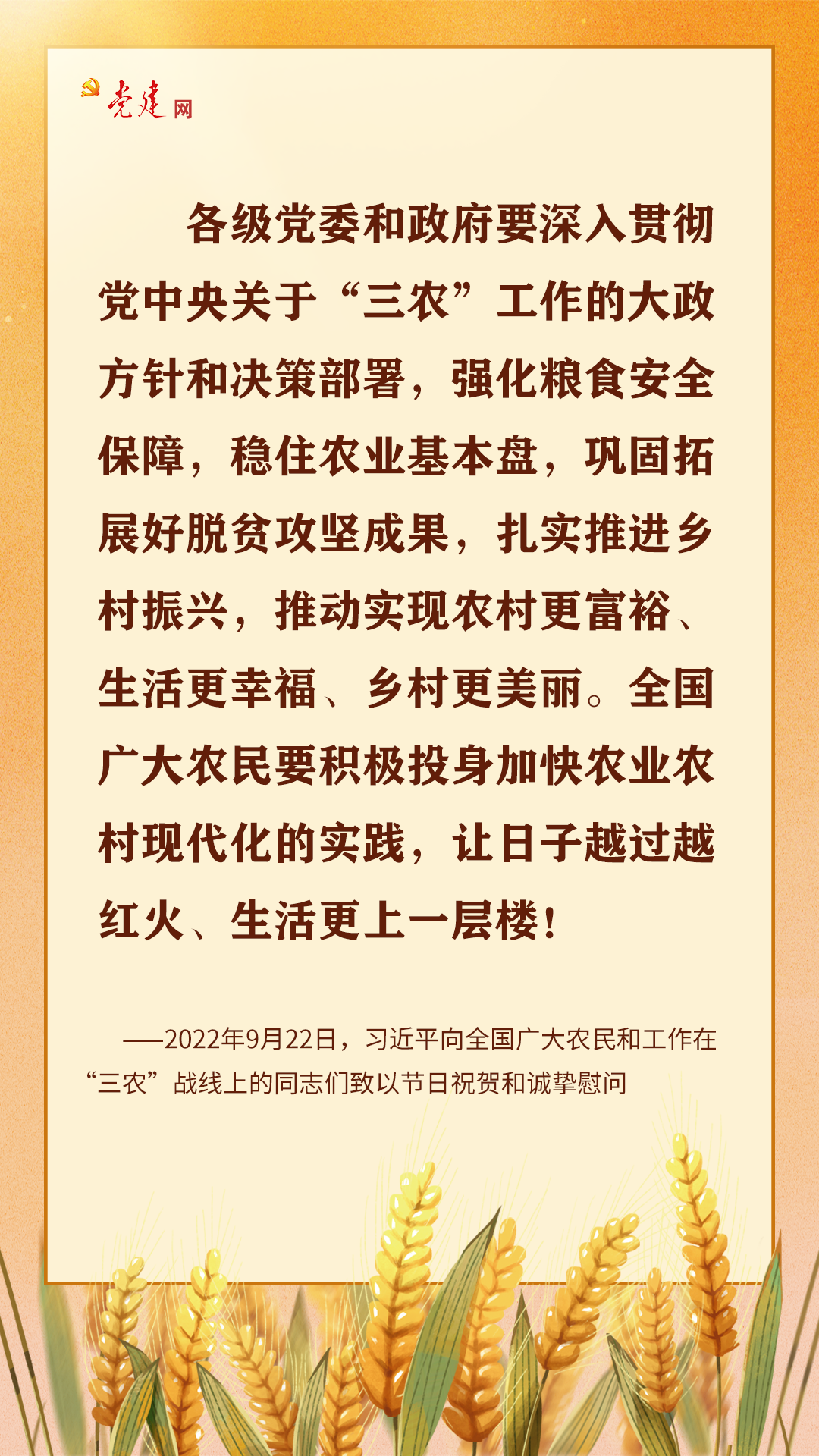 今年9月23日是第五个“中国农民丰收节”,习近平总书记代表党中央,向全国广大农民和工作在“三农”战线上的同志们致以节日的祝贺和诚挚的慰问。习近平总书记高度重视“三农”工作,经常走入田间地头、捧起麦苗稻穗,与农民深情话家常。今天,党建网微平台与您一起在习近平总书记的重要论述中感悟丰收的喜悦。