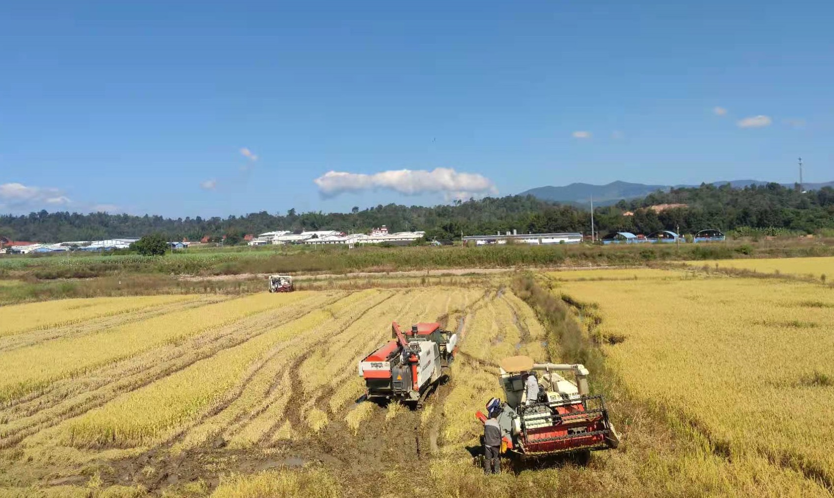 云南省勐海县的晚稻已进入收获期,蓝天白云下的金色稻田格外好看。西双版纳菁钰祥莱农业有限公司负责人黄坤来到位于勐海县勐海镇的晚稻种植基地,准备收割。