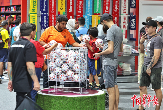 11月19日,卡塔尔多哈贝达公园球迷广场的世界杯纪念品商店里,球迷们在挑选小足球。这些纪念商品中的70%来自“中国制造”。