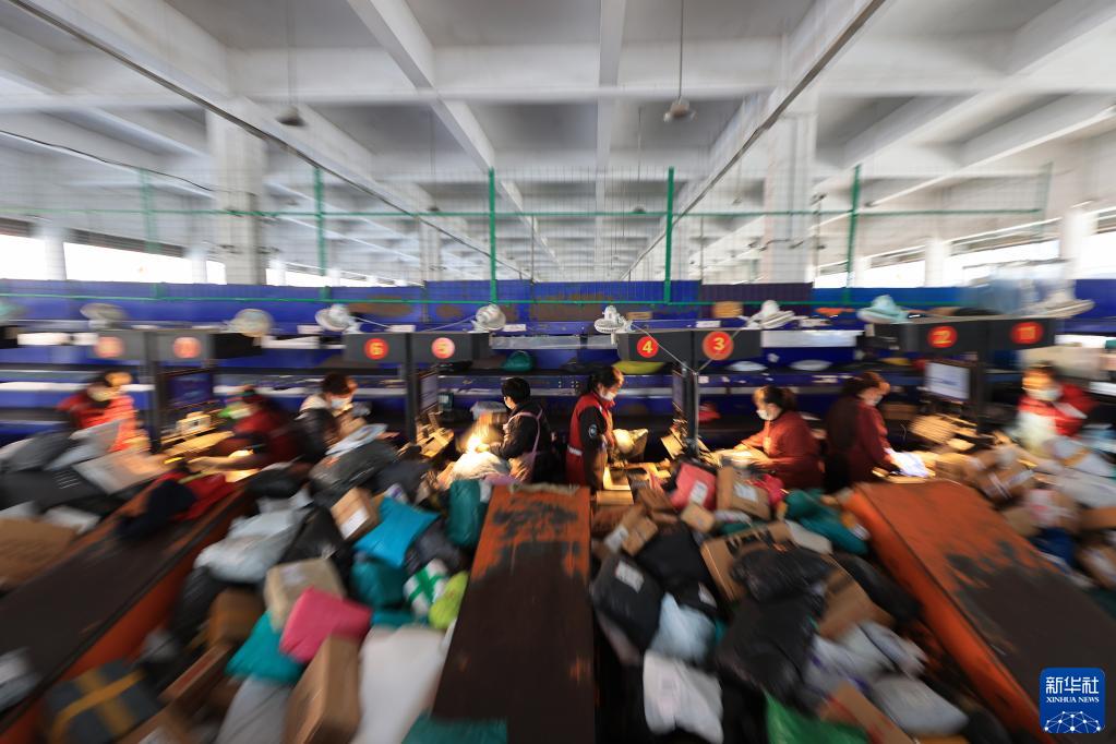 在浙江省湖州市吴兴区八里店镇一家物流企业,工作人员分拣快递(2022年12月12日摄)。新华社发(何伟卫摄)