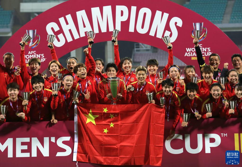 这是2022年2月6日,中国队在2022女足亚洲杯颁奖仪式上庆祝。新华社发(贾韦德·达尔 摄)