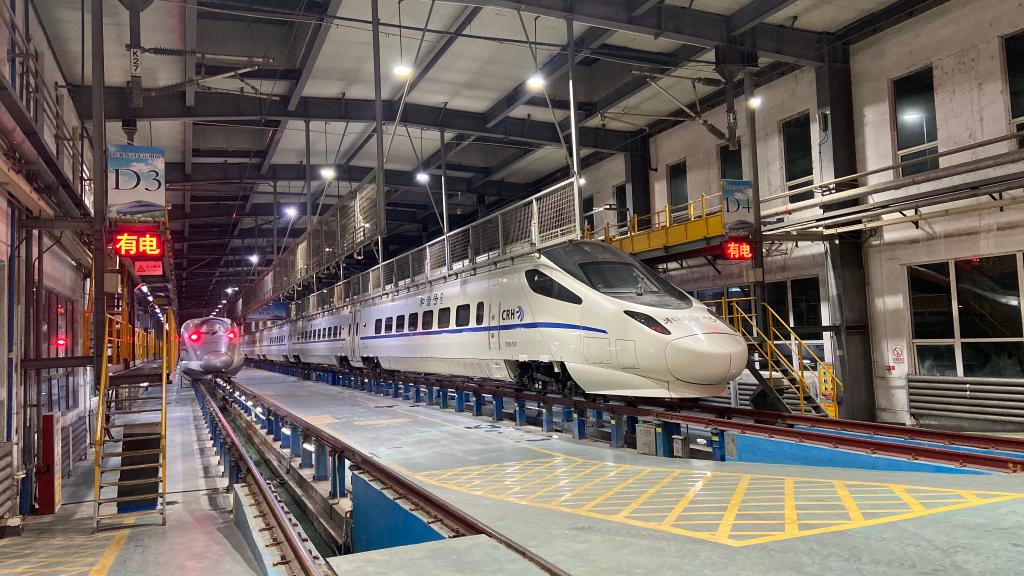 晚上8点,一列满载旅客的动车组列车在石家庄火车站完成落客后,缓缓驶入位于车站南侧的中国铁路北京局集团有限公司北京动车段石家庄动车运用所。28岁的机械师李旭日戴好安全帽,拿上手电,开始了一天的工作。