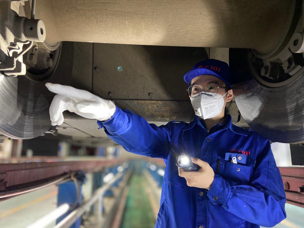 采访过程中,记者跟随李旭日钻到列车底部的检修通道。狭窄的空间里,他们要完成检查、保养、更换零部件等各项工作。只见他动作敏捷、操作熟练,打着手电不断敲击,仔细查看每一处零部件,不时用粉笔做着标记。接口有没有裂纹、螺丝有没有松动……这些常见问题,他用手一摸就能发现。