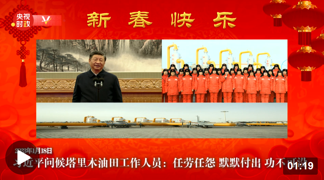 位于新疆塔克拉玛干沙漠的中石油塔里木油田是我国陆上第三大油气田,也是我国“西气东输”的主力气源地,为南疆和下游沿线15个省区市民生用气提供保障。习近平同塔里木油田公司轮南油气储运中心西气东输第一站克拉集气区连线。节日期间大家能轮休吗?你们在外过年,年货都准备好了吗?习近平问得仔细,现场员工一一作答。总书记叮嘱他们站好岗、供好气,保障人民群众度过一个欢乐祥和的春节。
