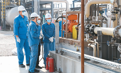 在伊拉克米桑油田布泽干终端厂,中伊双方员工正在探讨解决脱水泵故障问题。