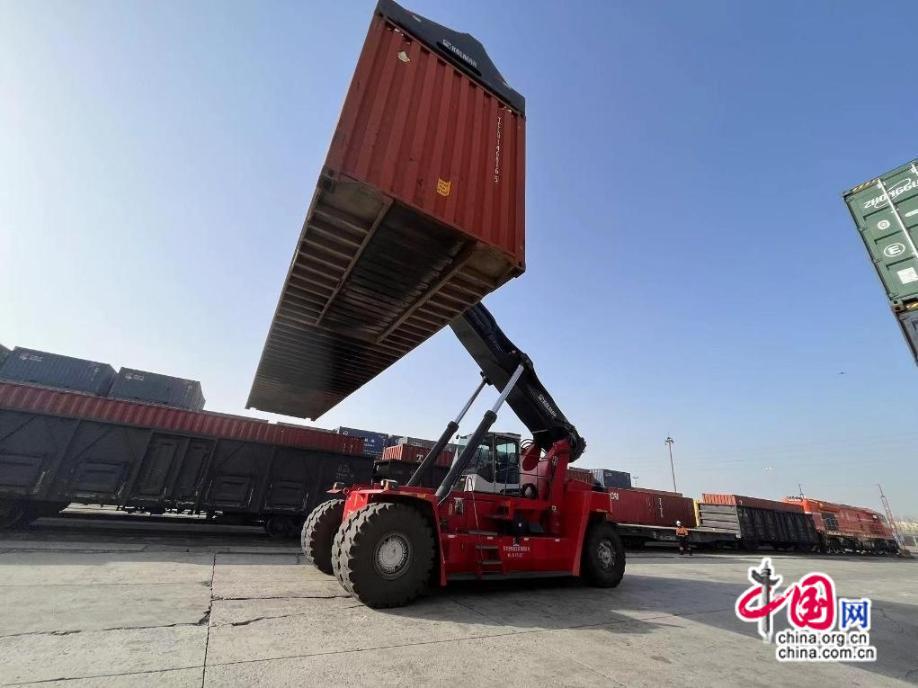 1月19日,集装箱叉车将货物装载到中欧班列货运列车上。中国网记者 唐佳蕾/摄