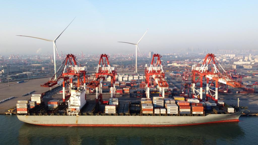 1月1日,一艘货轮靠泊在天津港联盟国际集装箱码头进行装卸作业。新华社记者 赵子硕 摄