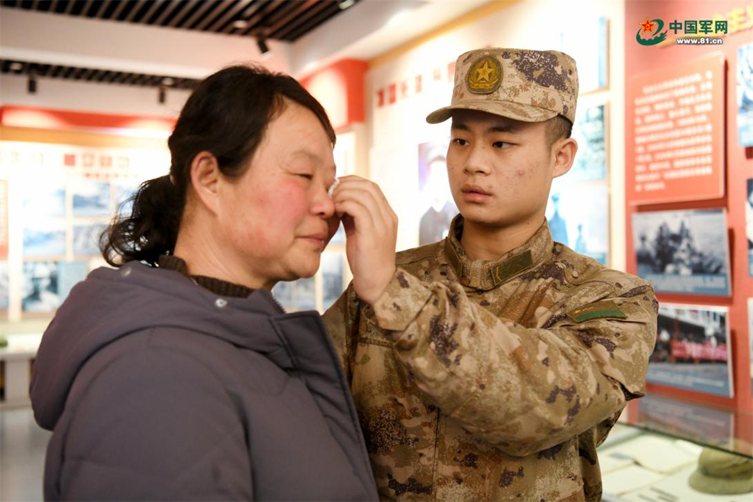 指导员王玉恒为二老讲述连史,动情之处,肖妈妈流下了感动的泪水。季鹏 摄