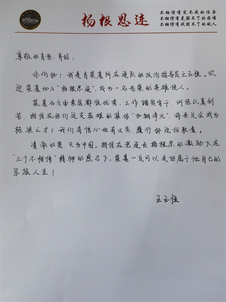 “爸妈,你们好!很荣幸能和荣基一起来到‘杨根思连’这个英雄集体,接下来我们会团结一心、共同成长。”