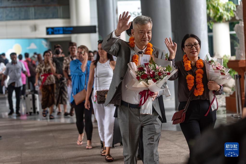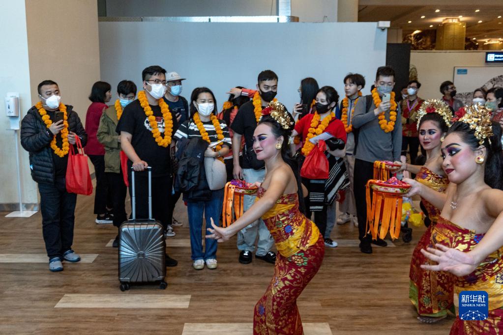 印度尼西亚旅游部和巴厘岛省政府22日上午举行仪式,欢迎2023年首个中国游客包机从深圳抵达巴厘岛。