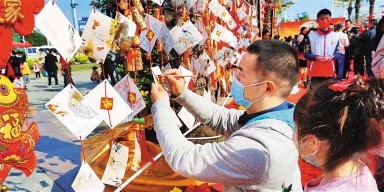 ▼1月19日,广州市花都区迎春花市“诗意花市”展区,众人踊跃参与诗词灯谜竞猜活动。