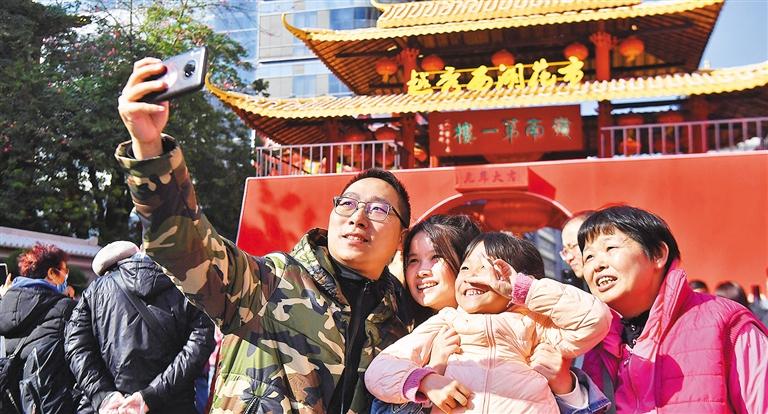 ◀1月19日,市民在广州越秀区西湖花市主牌楼前合影留念。