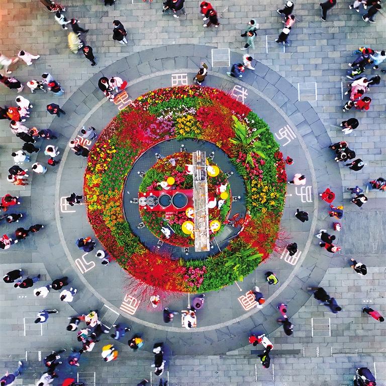 ◀1月19日,广州越秀区西湖花市上的铜壶滴漏花景,桃花、旅人蕉、万寿菊和蝴蝶兰等年宵花交相争艳。钟 涌摄(中经视觉)