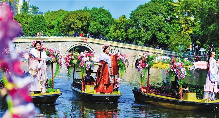 ▼1月18日,2023年广州水上花市开启,以“荔枝湾”“泮塘古村”“十三行”等文化旅游名片命名的特色花舫在湖面巡游。王 燕摄(中经视觉)