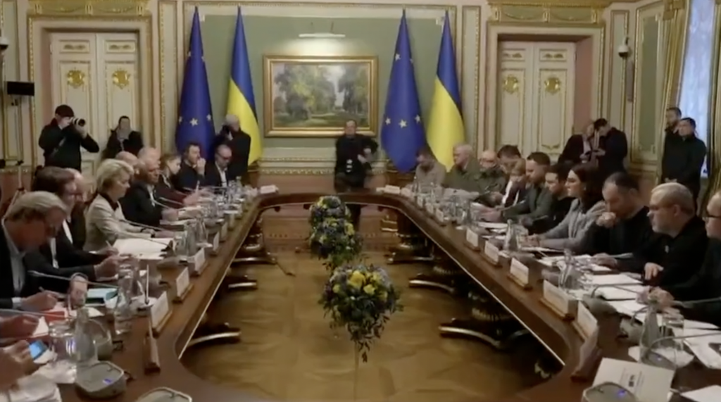 峰会前一天,泽连斯基在基辅会见了到访的欧盟委员会主席冯德莱恩。在会后举行的联合记者会上,泽连斯基称他收到了欧盟提供的关于乌克兰申请加入欧盟调查问卷第二部分的书面报告。他表示,欧盟的回复报告将作为乌政府开展工作的依据。