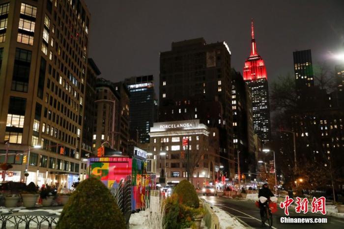 资料图:当地时间2021年2月10日,美国纽约帝国大厦为中国春节点亮红色灯光。中新社记者 廖攀 摄