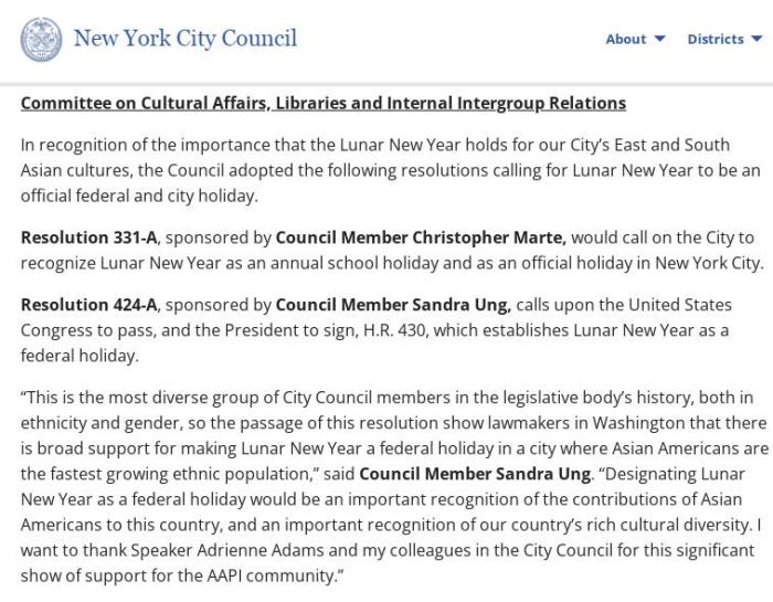 当天,纽约市议会还表决通过了一项由市议员黄敏仪在2022年12月提出的424号决议案,该案呼吁美国国会及总统拜登支持国会议员孟昭文提出的将农历新年定为联邦假日的法案。