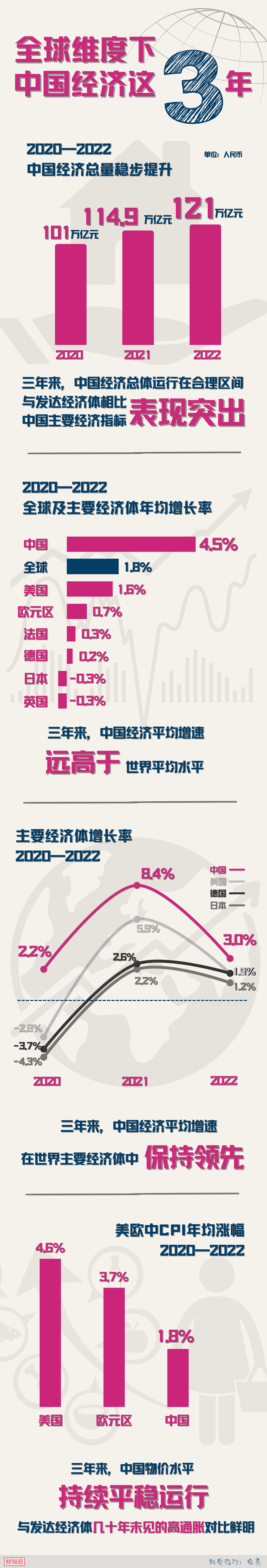 新冠疫情暴发以来,中国在世界主要经济体中保持增速领先。过去三年里,中国经济年均增长4.5%,增速远高于世界经济平均增速1.8%,也高于美国、欧元区和日本的1.6%、0.7%和-0.3%。