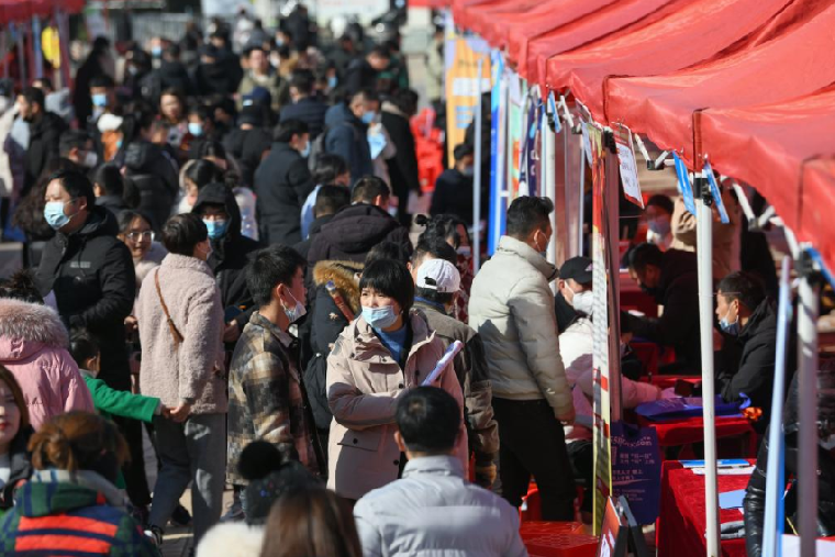 1月29日,阜阳市颍泉区在青颍公园东门广场举行专场招聘会。(庞诚 摄)