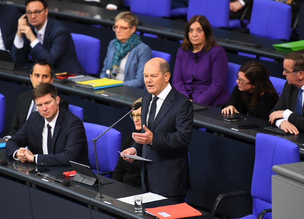1月25日,德国总理朔尔茨(前排右一)在位于柏林的德国联邦议会接受问询。新华社记者任鹏飞摄