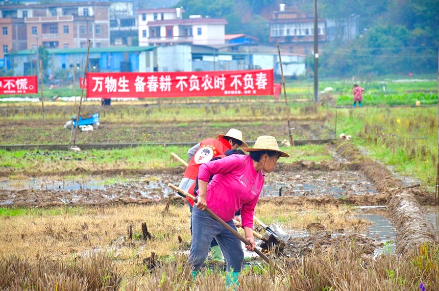 清理沟壑、蓄水翻耕,近日,在广西寨圩镇竹较村委东岸村粮食高产示范点,春耕备耕热潮涌动。“新的一年,我们确保完成2023年撂荒地治理率98%以上的目标任务,让群众有实惠、有盼头,让撂荒地成为致富田。”寨圩镇党委书记赖广威对记者说。