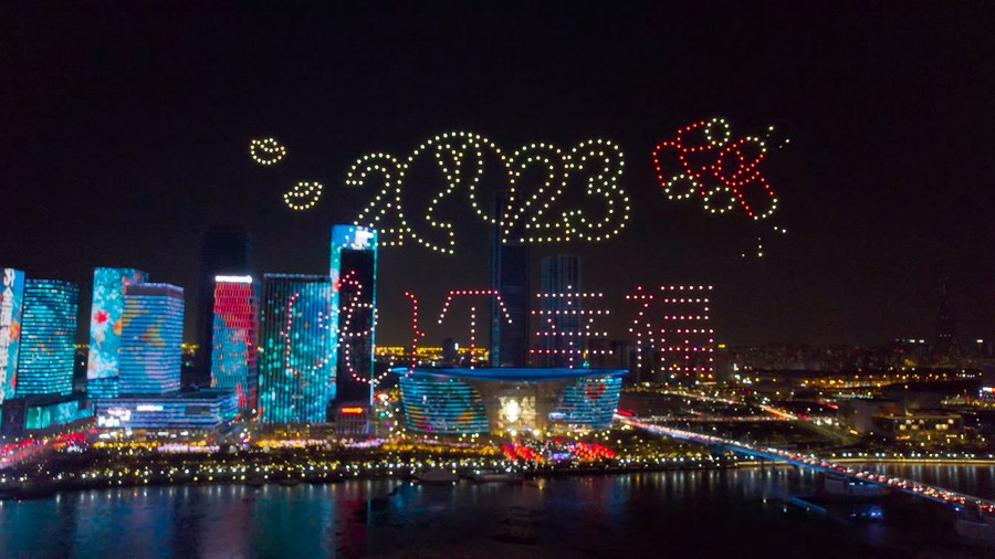 参演无人机最多的一次在重庆。除夕夜,3000架无人机在当地的地标朝天门表演了15分钟,一幅幅形象生动、色彩丰富的“画面”在夜空中铺展,吸引了众多观众。