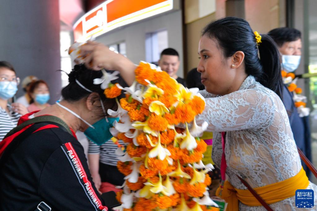 2月12日,在印度尼西亚巴厘岛伍拉莱国际机场,工作人员为中国游客佩戴迎宾花环。新华社记者 徐钦 摄