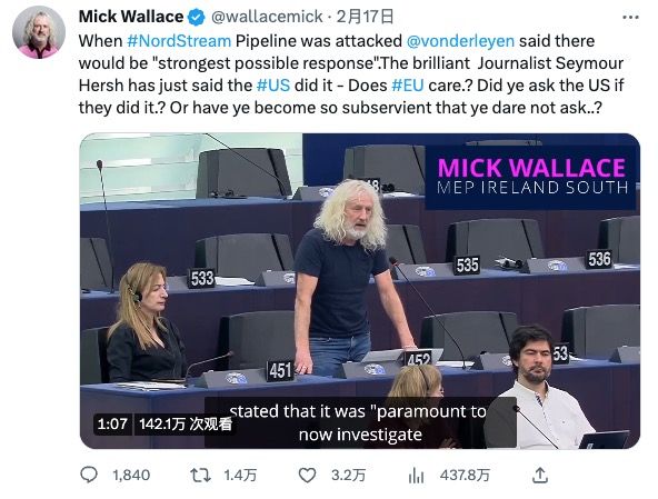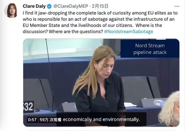关注“北溪”事件真相的是两名爱尔兰籍议员——米克·华莱士和克莱尔·戴利。华莱士在发言中质疑说,在去年9月“北溪”管道遭破坏后,欧盟委员会主席冯德莱恩曾口口声声说调查工作“至关重要”、任何对欧洲能源供给的蓄意破坏“不可接受”,还发誓欧盟将作出“最强烈回应”,但如今美国记者赫什爆料美国是破坏管道的幕后主使,欧洲却沉默了。