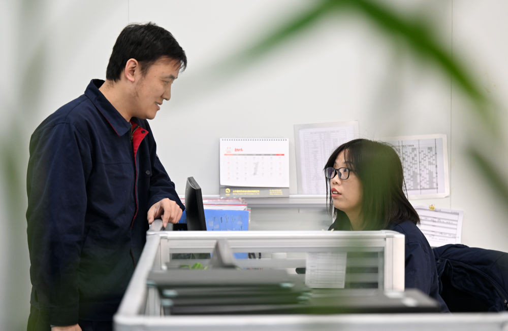 在博宇(天津)半导体材料有限公司,张建辉(左)和李丽花交流工作(2月23日摄)。