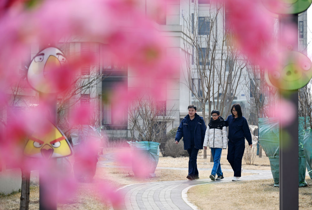 张建辉(左)、李丽花(右)一家三口在小区里散步(2月23日摄)。