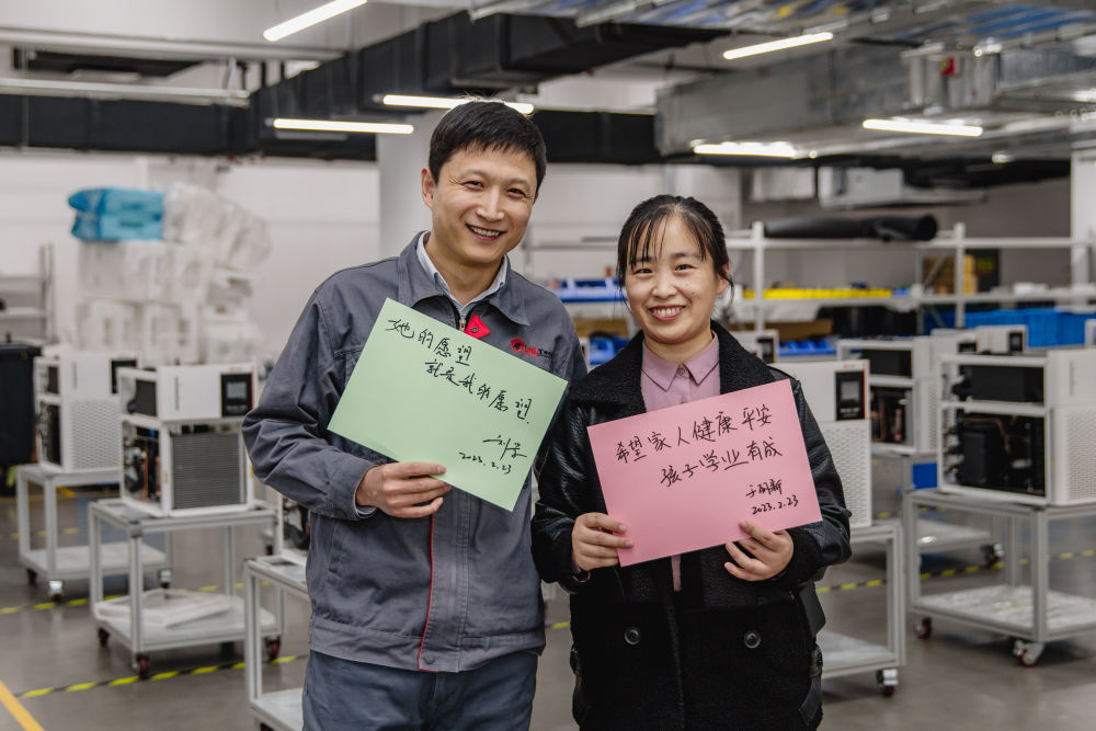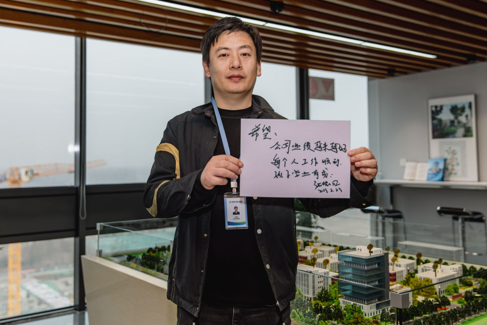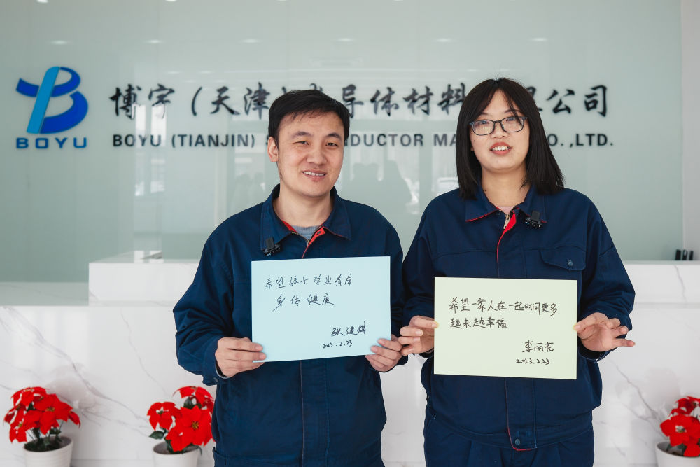 在博宇(天津)半导体材料有限公司,张建辉(左)和李丽花展示他们写下的心愿(2月23日摄)。