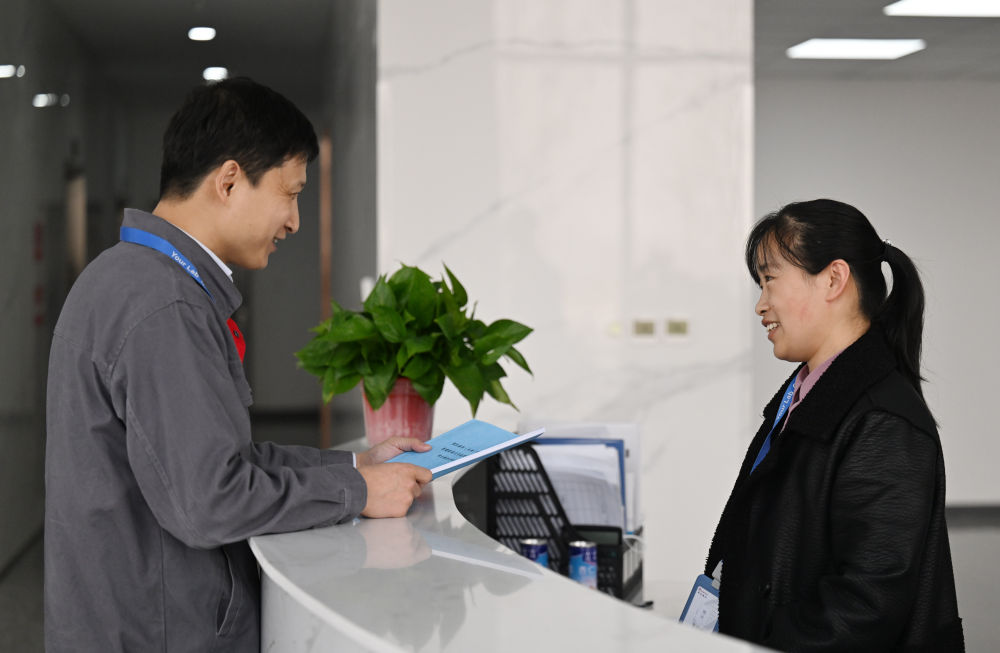 在莱伯泰科(天津)科技有限公司,刘学(左)和于丽新展示他们写下的心愿(2月23日摄)。在莱伯泰科(天津)科技有限公司,刘学在车间查看仪器设备(2月23日摄)。