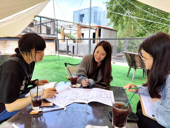 黄洁如(左二)与同事一起探讨业务。2019年她自主创业,结合西安古城文化元素的设计深受客户认可。(受访者供图)