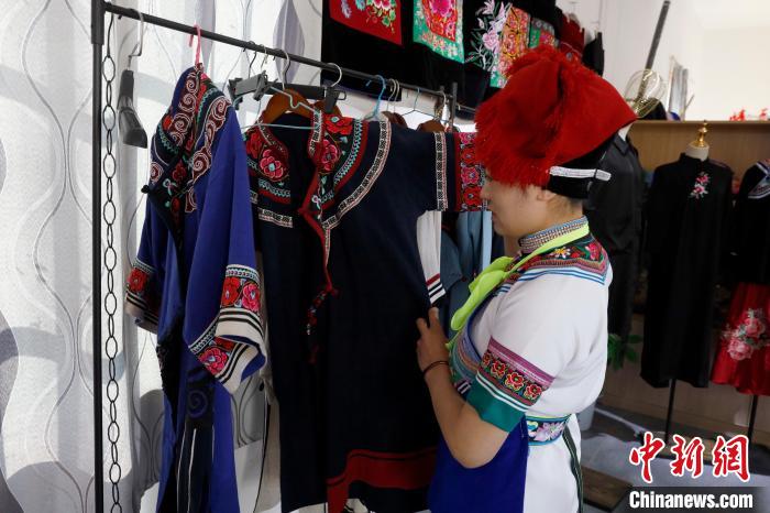 资料图为白沙坡村绣娘整理彝绣产品。 李嘉娴 摄