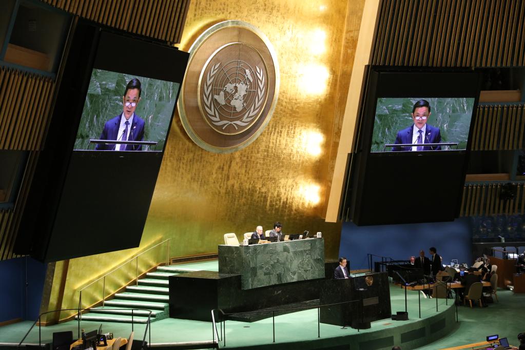 2月23日,在位于纽约的联合国总部,中国常驻联合国代表团临时代办戴兵在联合国大会乌克兰问题紧急特别会议上指出,无论困难多大,政治解决的大门不能关上,推动尽快实现停火止战是当务之急,输送武器不会带来和平。新华社记者谢锷摄
